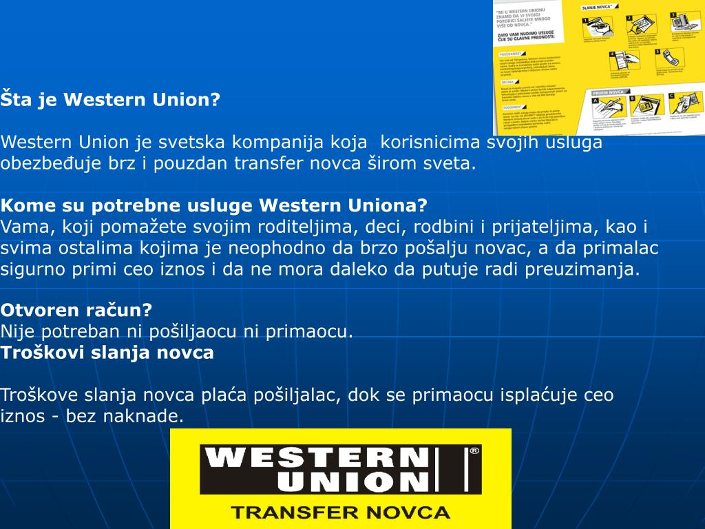 Šta je Western Union? Western Union je svetska kompanija koja korisnicima svojih usluga obezbeđuje brz i pouzdan transfer novca širom sveta. Kome su potrebne usluge Western Uniona? Vama, koji pomažete svojim roditeljima, deci, rodbini i prijateljima, kao i svima ostalima kojima je neophodno da brzo pošalju novac, a da primalac sigurno primi ceo iznos i da ne mora daleko da putuje radi preuzimanja. Otvoren račun? Nije potreban ni pošiljaocu ni primaocu. Troškovi slanja novca Troškove slanja novca plaća pošiljalac, dok se primaocu isplaćuje ceo iznos - bez naknade.