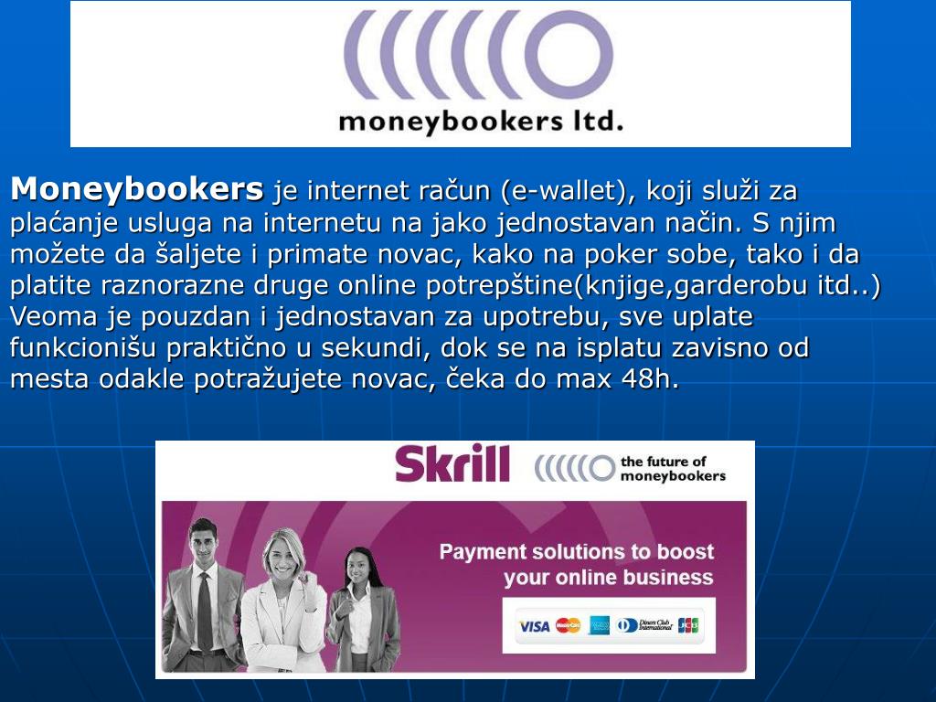 Moneybookers je internet račun (e-wallet), koji služi za plaćanje usluga na internetu na jako jednostavan način. S njim možete da šaljete i primate novac, kako na poker sobe, tako i da platite raznorazne druge online potrepštine(knjige,garderobu itd..) Veoma je pouzdan i jednostavan za upotrebu, sve uplate funkcionišu praktično u sekundi, dok se na isplatu zavisno od mesta odakle potražujete novac, čeka do max 48h.