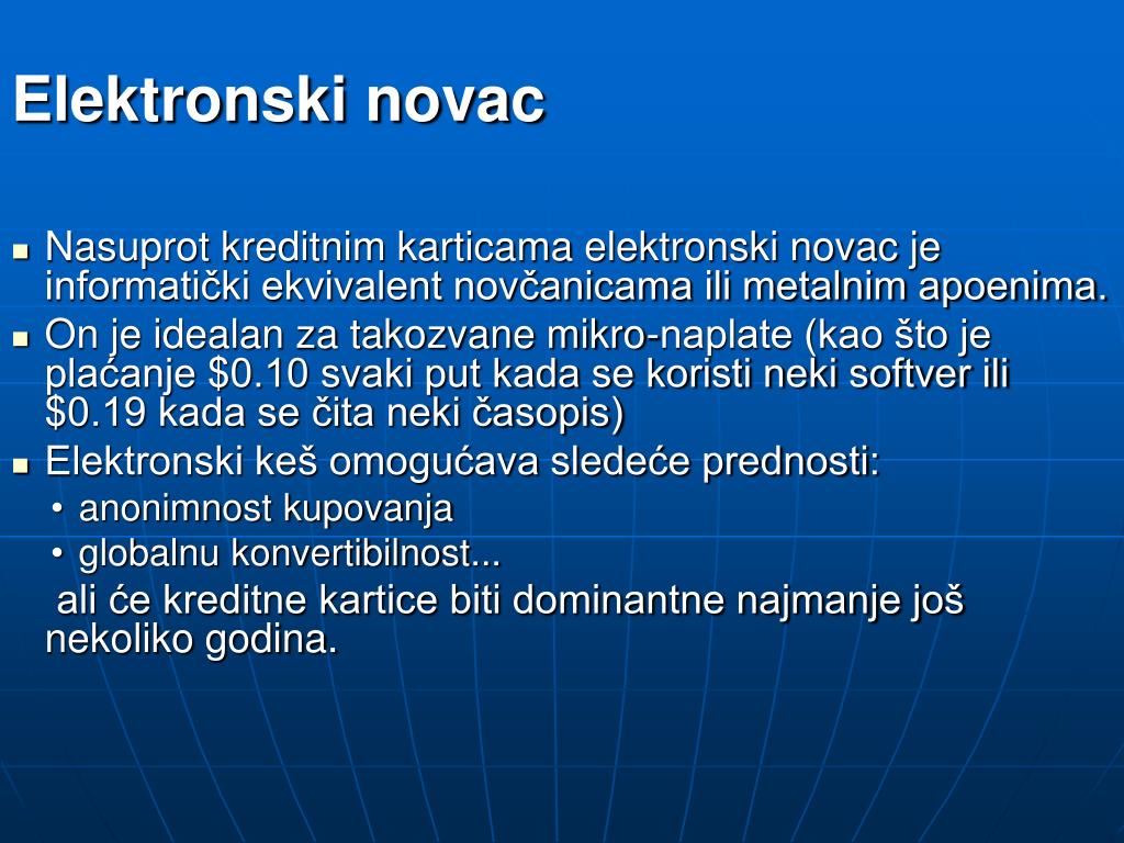 Elektronski novac • Nasuprot kreditnim karticama elektronski novac je informatički ekvivalent novčanicama ili metalnim apoenima. • On je idealan za takozvane mikro-naplate (kao što je plaćanje $0.10 svaki put kada se koristi neki softver ili $0.19 kada se čita neki časopis) • Elektronski keš omogućava sledeće prednosti: • anonimnost kupovanja • globalnu konvertibilnost... ali će kreditne kartice biti dominantne najmanje još nekoliko godina.