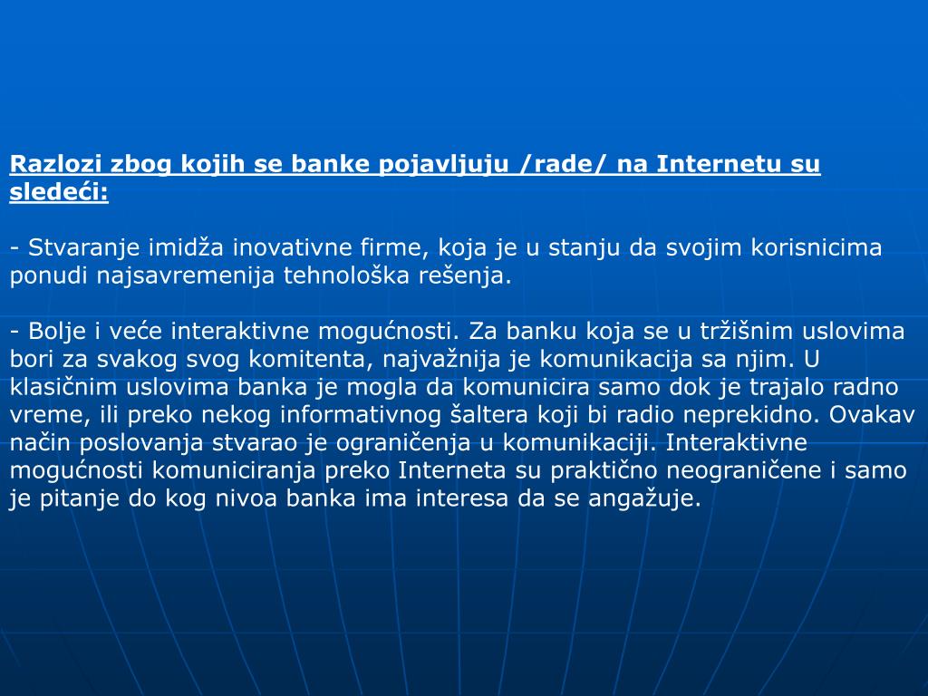 Razlozi zbog kojih se banke pojavljuju /rade/ na Internetu su sledeći: • Stvaranje imidža inovativne firme, koja je u stanju da svojim korisnicima ponudi najsavremenija tehnološka rešenja. • - Bolje i veće interaktivne mogućnosti. Za banku koja se u tržišnim uslovima bori za svakog svog komitenta, najvažnija je komunikacija sa njim. U klasičnim uslovima banka je mogla da komunicira samo dok je trajalo radno vreme, ili preko nekog informativnog šaltera koji bi radio neprekidno. Ovakav način poslovanja stvarao je ograničenja u komunikaciji. Interaktivne mogućnosti komuniciranja preko Interneta su praktično neograničene i samo je pitanje do kog nivoa banka ima interesa da se angažuje.