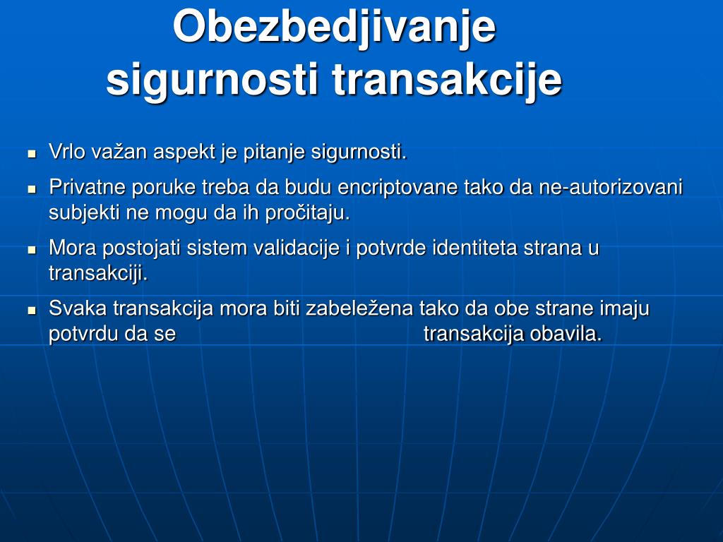 Obezbedjivanje sigurnosti transakcije • Vrlo važan aspekt je pitanje sigurnosti. • Privatne poruke treba da budu encriptovane tako da ne-autorizovani subjekti ne mogu da ih pročitaju. • Mora postojati sistem validacije i potvrde identiteta strana u transakciji. • Svaka transakcija mora biti zabeležena tako da obe strane imaju potvrdu da se transakcija obavila.