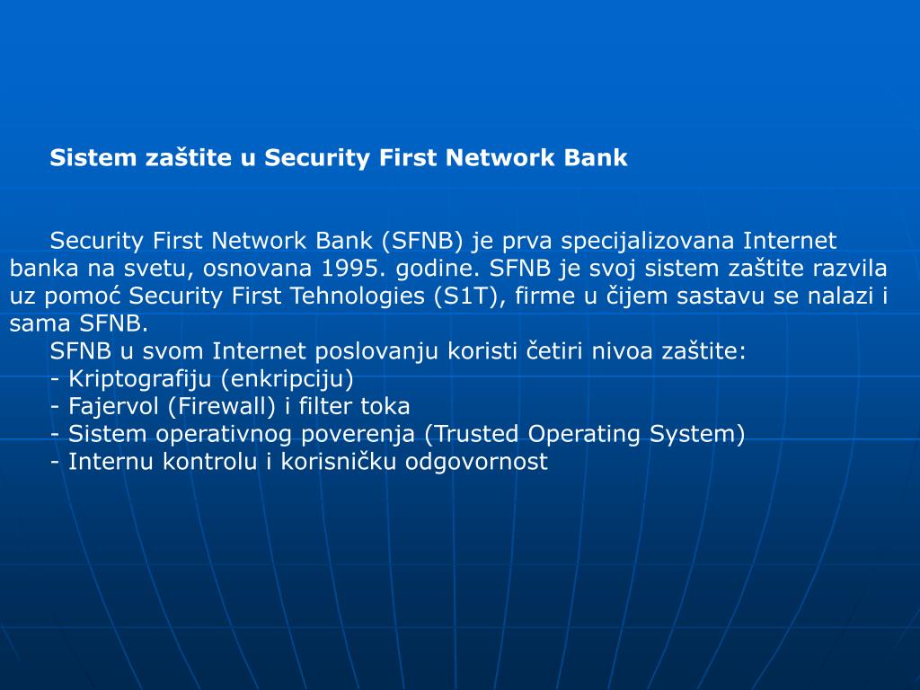 Sistem zaštite u Security First Network Bank Security First Network Bank (SFNB) je prva specijalizovana Internet banka na svetu, osnovana 1995. godine. SFNB je svoj sistem zaštite razvila uz pomoć Security First Tehnologies (S1T), firme u čijem sastavu se nalazi i sama SFNB. SFNB u svom Internet poslovanju koristi četiri nivoa zaštite: - Kriptografiju (enkripciju) - Fajervol (Firewall) i filter toka - Sistem operativnog poverenja (Trusted Operating System) - Internu kontrolu i korisničku odgovornost