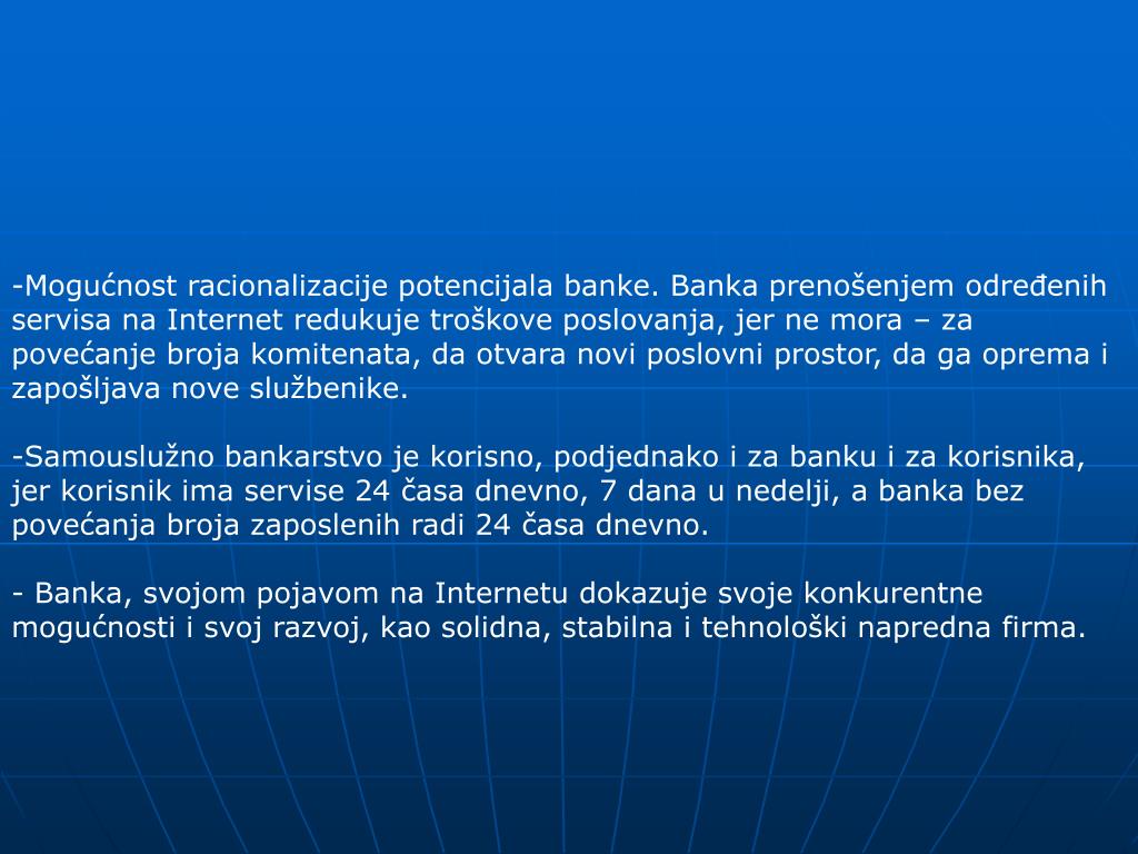 Mogućnost racionalizacije potencijala banke. Banka prenošenjem određenih servisa na Internet redukuje troškove poslovanja, jer ne mora – za povećanje broja komitenata, da otvara novi poslovni prostor, da ga oprema i zapošljava nove službenike. • Samouslužno bankarstvo je korisno, podjednako i za banku i za korisnika, jer korisnik ima servise 24 časa dnevno, 7 dana u nedelji, a banka bez povećanja broja zaposlenih radi 24 časa dnevno. • - Banka, svojom pojavom na Internetu dokazuje svoje konkurentne mogućnosti i svoj razvoj, kao solidna, stabilna i tehnološki napredna firma.