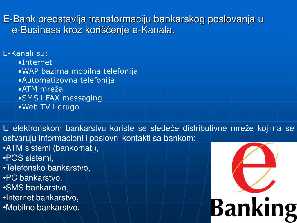 E-Bank predstavlja transformaciju bankarskog poslovanja u e-Business kroz korišćenje e-Kanala. • E-Kanali su: • Internet • WAP bazirna mobilna telefonija • Automatizovna telefonija • ATM mreža • SMS i FAX messaging • Web TV i drugo … • U elektronskom bankarstvu koriste se sledeće distributivne mreže kojima se ostvaruju informacioni i poslovni kontakti sa bankom: • ATM sistemi (bankomati), • POS sistemi, • Telefonsko bankarstvo, • PC bankarstvo, • SMS bankarstvo, • Internet bankarstvo, • Mobilno bankarstvo.