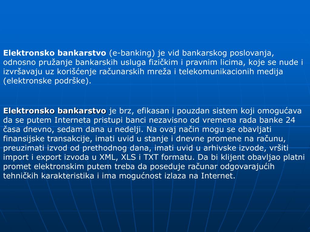 Elektronsko bankarstvo (e-banking) je vid bankarskog poslovanja, odnosno pružanje bankarskih usluga fizičkim i pravnim licima, koje se nude i izvršavaju uz korišćenje računarskih mreža i telekomunikacionih medija (elektronske podrške). Elektronsko bankarstvo je brz, efikasan i pouzdan sistem koji omogućava da se putem Interneta pristupi banci nezavisno od vremena rada banke 24 časa dnevno, sedam dana u nedelji. Na ovaj način mogu se obavljati finansijske transakcije, imati uvid u stanje i dnevne promene na računu, preuzimati izvod od prethodnog dana, imati uvid u arhivske izvode, vršiti import i export izvoda u XML, XLS i TXT formatu. Da bi klijent obavljao platni promet elektronskim putem treba da poseduje računar odgovarajućih tehničkih karakteristika i ima mogućnost izlaza na Internet.