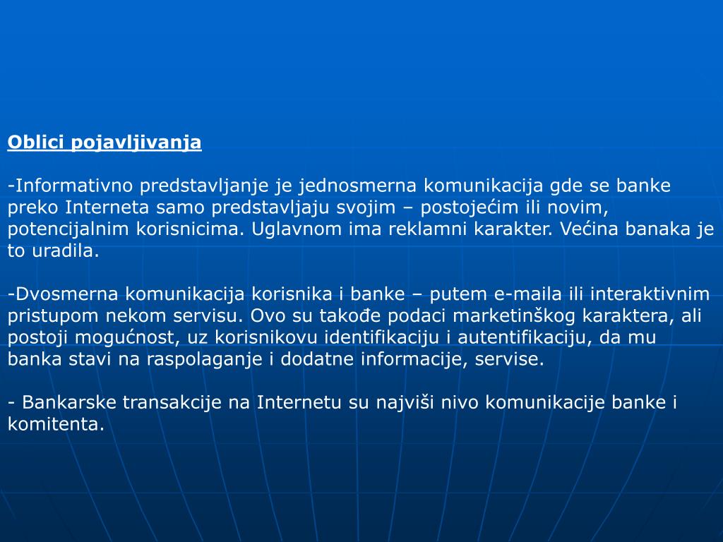 Oblici pojavljivanja • Informativno predstavljanje je jednosmerna komunikacija gde se banke preko Interneta samo predstavljaju svojim – postojećim ili novim, potencijalnim korisnicima. Uglavnom ima reklamni karakter. Većina banaka je to uradila. • Dvosmerna komunikacija korisnika i banke – putem e-maila ili interaktivnim pristupom nekom servisu. Ovo su takođe podaci marketinškog karaktera, ali postoji mogućnost, uz korisnikovu identifikaciju i autentifikaciju, da mu banka stavi na raspolaganje i dodatne informacije, servise. • - Bankarske transakcije na Internetu su najviši nivo komunikacije banke i komitenta.