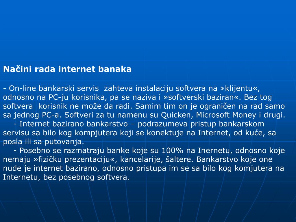Načini rada internet banaka - On-line bankarski servis zahteva instalaciju softvera na »klijentu«, odnosno na PC-ju korisnika, pa se naziva i »softverski baziran«. Bez tog softvera korisnik ne može da radi. Samim tim on je ograničen na rad samo sa jednog PC-a. Softveri za tu namenu su Quicken, Microsoft Money i drugi. - Internet bazirano bankarstvo – podrazumeva pristup bankarskom servisu sa bilo kog kompjutera koji se konektuje na Internet, od kuće, sa posla ili sa putovanja. - Posebno se razmatraju banke koje su 100% na Inernetu, odnosno koje nemaju »fizičku prezentaciju«, kancelarije, šaltere. Bankarstvo koje one nude je internet bazirano, odnosno pristupa im se sa bilo kog komjutera na Internetu, bez posebnog softvera.