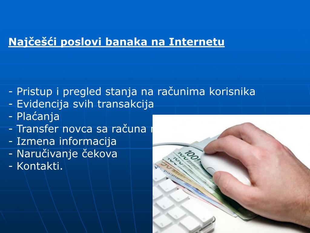 Najčešći poslovi banaka na Internetu - Pristup i pregled stanja na računima korisnika - Evidencija svih transakcija - Plaćanja - Transfer novca sa računa na račun - Izmena informacija - Naručivanje čekova - Kontakti.