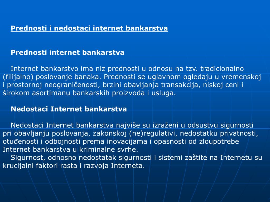 Prednosti i nedostaci internet bankarstva Prednosti internet bankarstva Internet bankarstvo ima niz prednosti u odnosu na tzv. tradicionalno (filijalno) poslovanje banaka. Prednosti se uglavnom ogledaju u vremenskoj i prostornoj neograničenosti, brzini obavljanja transakcija, niskoj ceni i širokom asortimanu bankarskih proizvoda i usluga. Nedostaci Internet bankarstva Nedostaci Internet bankarstva najviše su izraženi u odsustvu sigurnosti pri obavljanju poslovanja, zakonskoj (ne)regulativi, nedostatku privatnosti, otuđenosti i odbojnosti prema inovacijama i opasnosti od zloupotrebe Internet bankarstva u kriminalne svrhe. Sigurnost, odnosno nedostatak sigurnosti i sistemi zaštite na Internetu su krucijalni faktori rasta i razvoja Interneta.