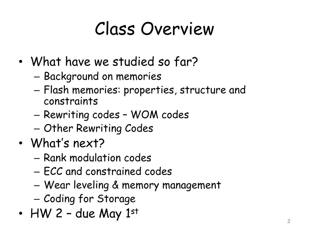Class Overview • What have we studied so far? • Background on memories • Flash memories: properties, structure and constraints • Rewriting codes – WOM codes • Other Rewriting Codes • What’s next? • Rank modulation codes • ECC and constrained codes • Wear leveling & memory management • Coding for Storage • HW 2 – due May 1st