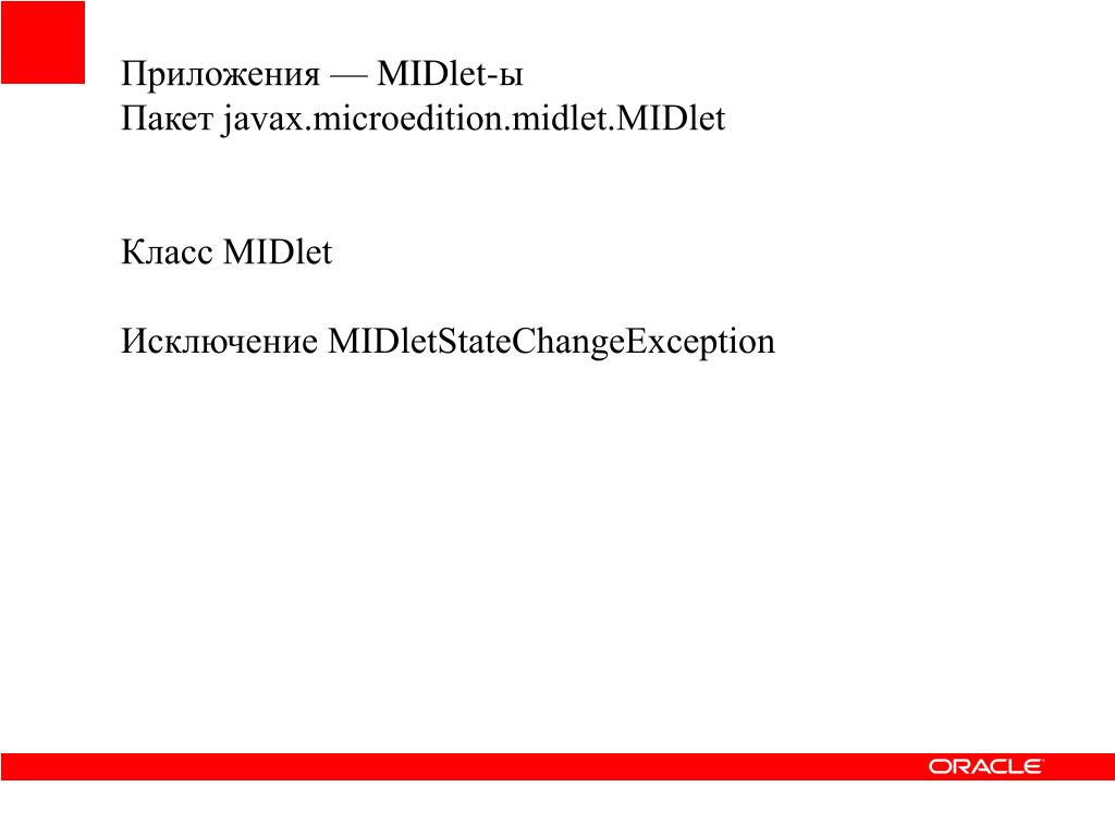 Приложения — MIDlet-ы Пакет javax.microedition.midlet.MIDlet Класс MIDlet Исключение MIDletStateChangeException