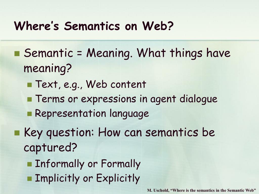 Where’s Semantics on Web? • Semantic = Meaning. What things have meaning? • Text, e.g., Web content • Terms or expressions in agent dialogue • Representation language • Key question: How can semantics be captured? • Informally or Formally • Implicitly or Explicitly M. Uschold, “Where is the semantics in the Semantic Web”