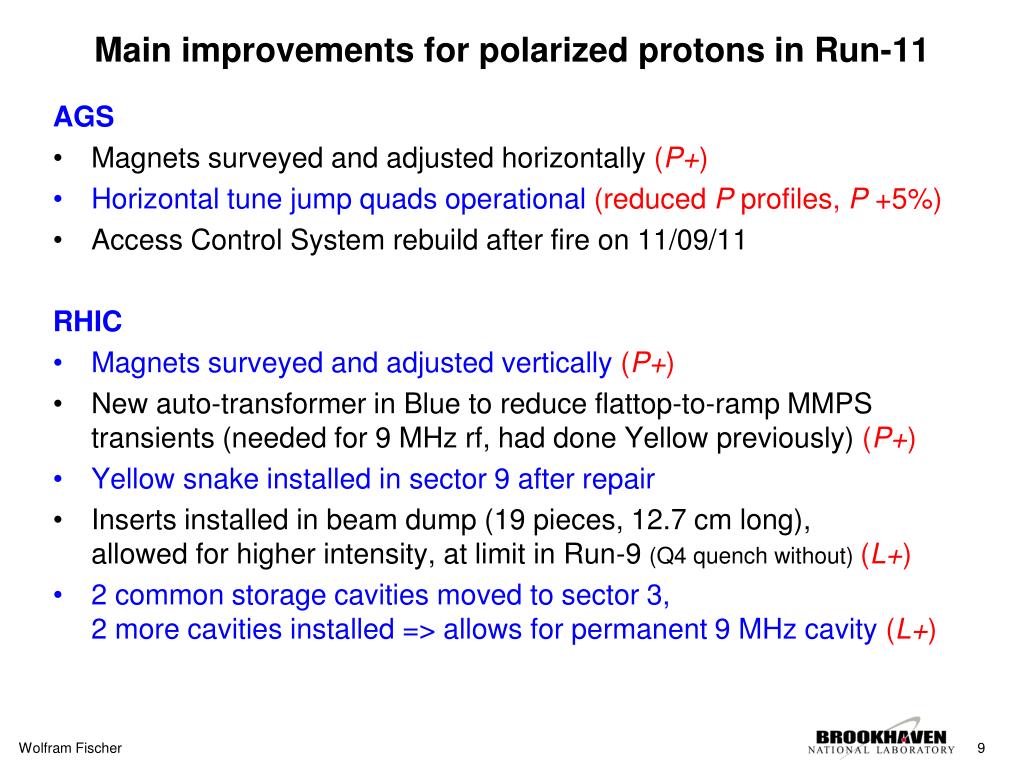 Main improvements for polarized protons in Run-11 • AGS • Magnets surveyed and adjusted horizontally (P+) • Horizontal tune jump quads operational (reduced P profiles, P +5%) • Access Control System rebuild after fire on 11/09/11 • RHIC • Magnets surveyed and adjusted vertically (P+) • New auto-transformer in Blue to reduce flattop-to-ramp MMPS transients (needed for 9 MHz rf, had done Yellow previously) (P+) • Yellow snake installed in sector 9 after repair • Inserts installed in beam dump (19 pieces, 12.7 cm long), allowed for higher intensity, at limit in Run-9 (Q4 quench without) (L+) • 2 common storage cavities moved to sector 3, 2 more cavities installed => allows for permanent 9 MHz cavity (L+) 9