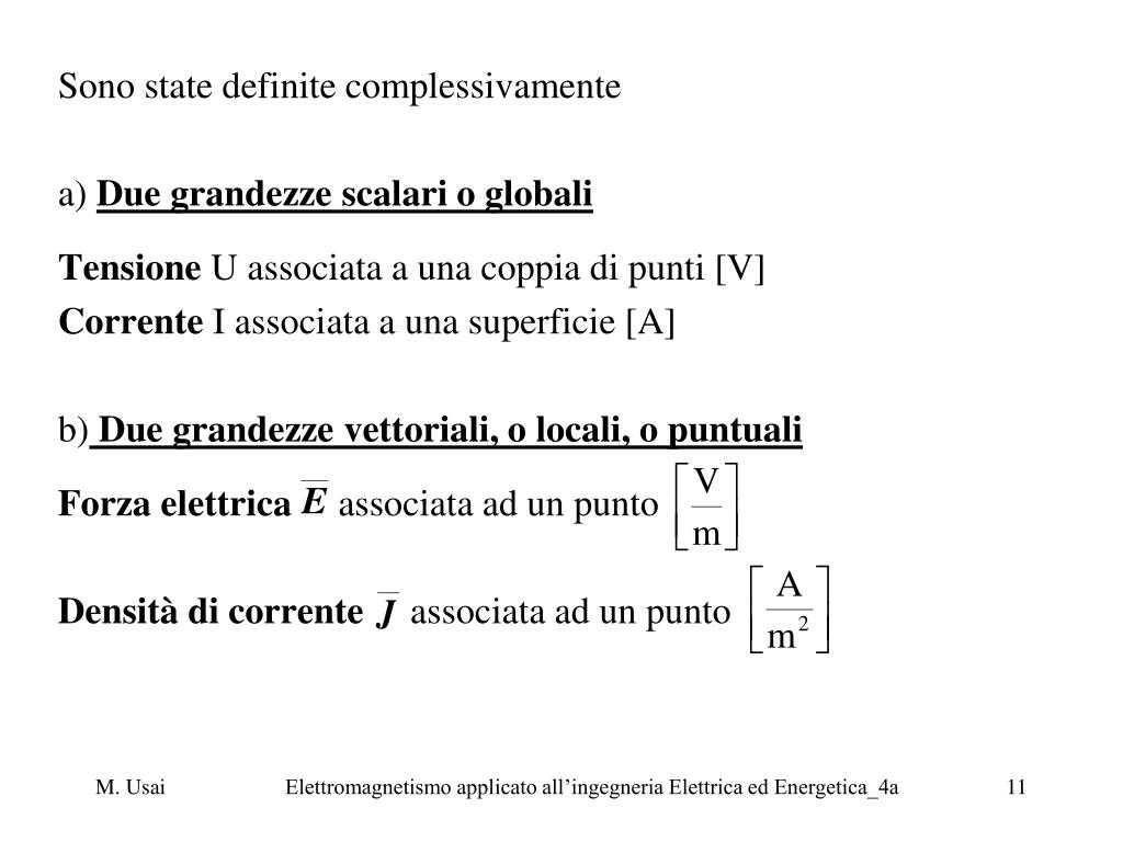 Sono state definite complessivamente a) Due grandezze scalari o globali Tensione U associata a una coppia di punti [V] Corrente I associata a una superficie [A] b)Due grandezze vettoriali, o locali, o puntuali Forza elettrica associata ad un punto Densità di corrente associata ad un punto Elettromagnetismo applicato all’ingegneria Elettrica ed Energetica_4a