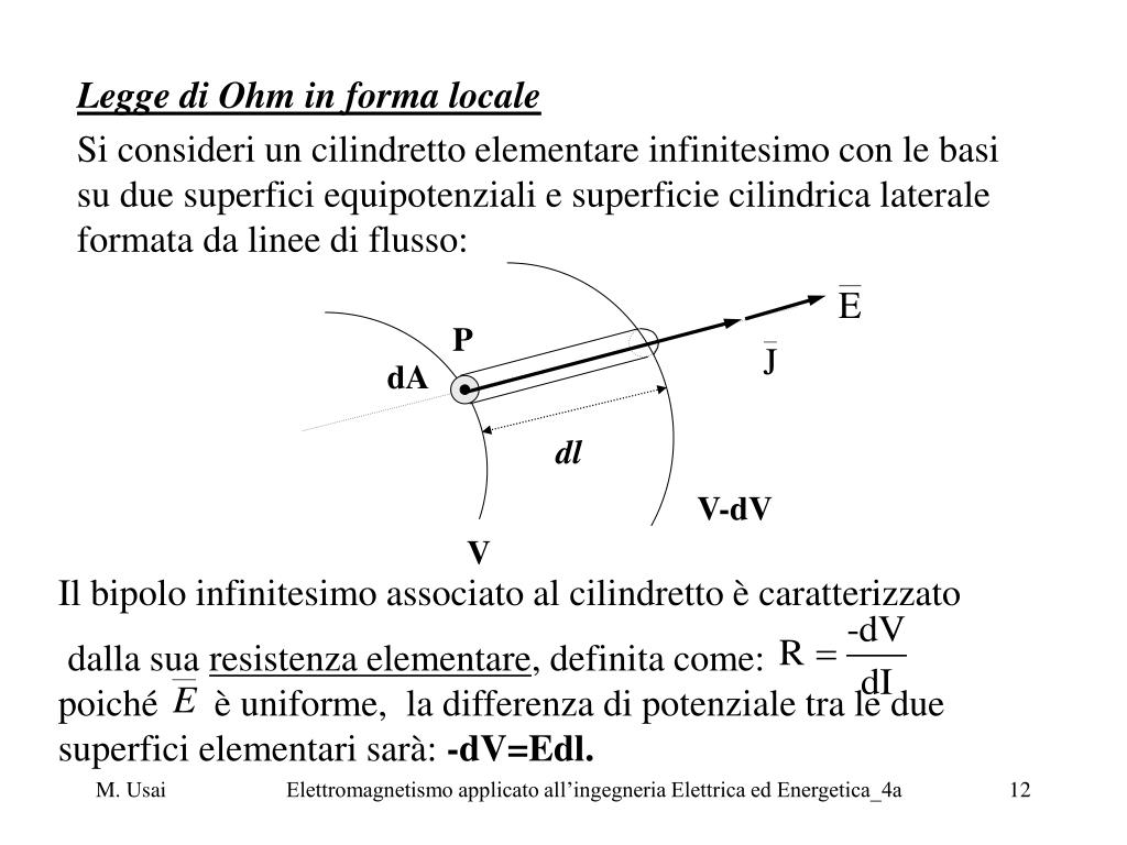Se è in ogni punto uniforme indipendente dalla posizione del punto P, la corrente è deducibile dalla relazione . Inoltre poiché per il principio di conservazione dell’energia la corrente attraverso una superficie chiusa deve essere uguale a zero: e applicando il teorema della divergenza : Dove V è il volume racchiuso dalla superficie A, da cui: (con operatore di divergenza), Quindi il vettore densità di corrente è solenoidale. Questa è la legge delle correnti in forma locale. Elettromagnetismo applicato all’ingegneria Elettrica ed Energetica_4a