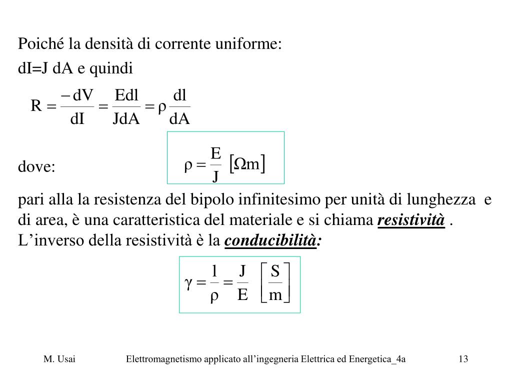 Poiché la densità di corrente uniforme: dI=J dA e quindi dove: pari alla la resistenza del bipolo infinitesimo per unità di lunghezza e di area, è una caratteristica del materiale e si chiama resistività . L’inverso della resistività è la conducibilità: Elettromagnetismo applicato all’ingegneria Elettrica ed Energetica_4a