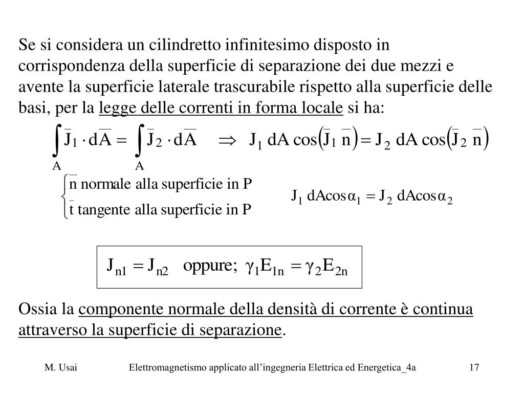 Se si considera un cilindretto infinitesimo disposto in corrispondenza della superficie di separazione dei due mezzi e avente la superficie laterale trascurabile rispetto alla superficie delle basi, per la legge delle correnti in forma locale si ha: Ossia la componente normale della densità di corrente è continua attraverso la superficie di separazione. Elettromagnetismo applicato all’ingegneria Elettrica ed Energetica_4a
