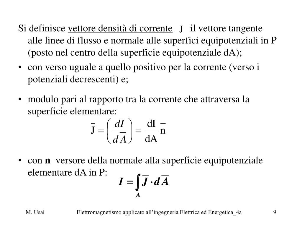 Si definisce vettore densità di corrente il vettore tangente alle linee di flusso e normale alle superfici equipotenziali in P (posto nel centro della superficie equipotenziale dA); • con verso uguale a quello positivo per la corrente (verso i potenziali decrescenti) e; • modulo pari al rapporto tra la corrente che attraversa la superficie elementare: • con n versore della normale alla superficie equipotenziale elementare dA in P: Elettromagnetismo applicato all’ingegneria Elettrica ed Energetica_4a