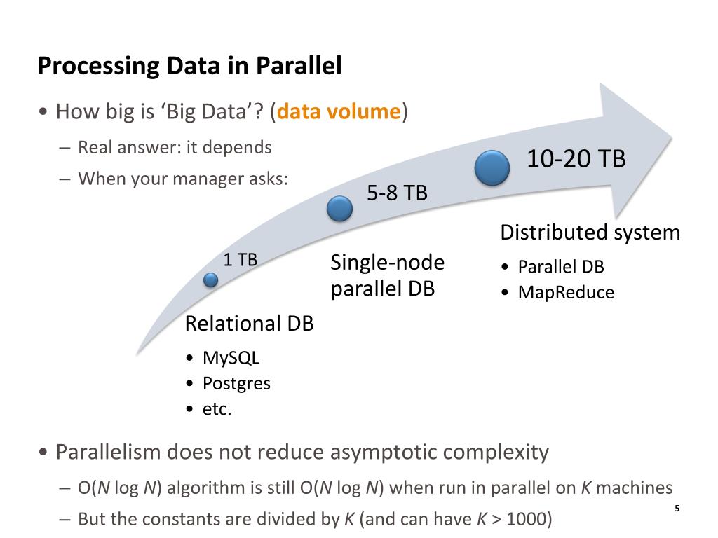 Processing Data in Parallel • How big is ‘Big Data’? (data volume) • Real answer: it depends • When your manager asks: • Parallelism does not reduce asymptotic complexity • O(N log N) algorithm is still O(N log N) when run in parallel on K machines • But the constants are divided by K (and can have K > 1000) • 10-20 TB • 5-8 TB • 1 TB