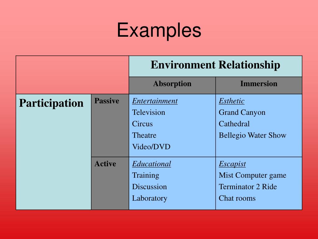 Realms of Experience Absorption Passive Participation Active Participation Sweet Spot Immersion