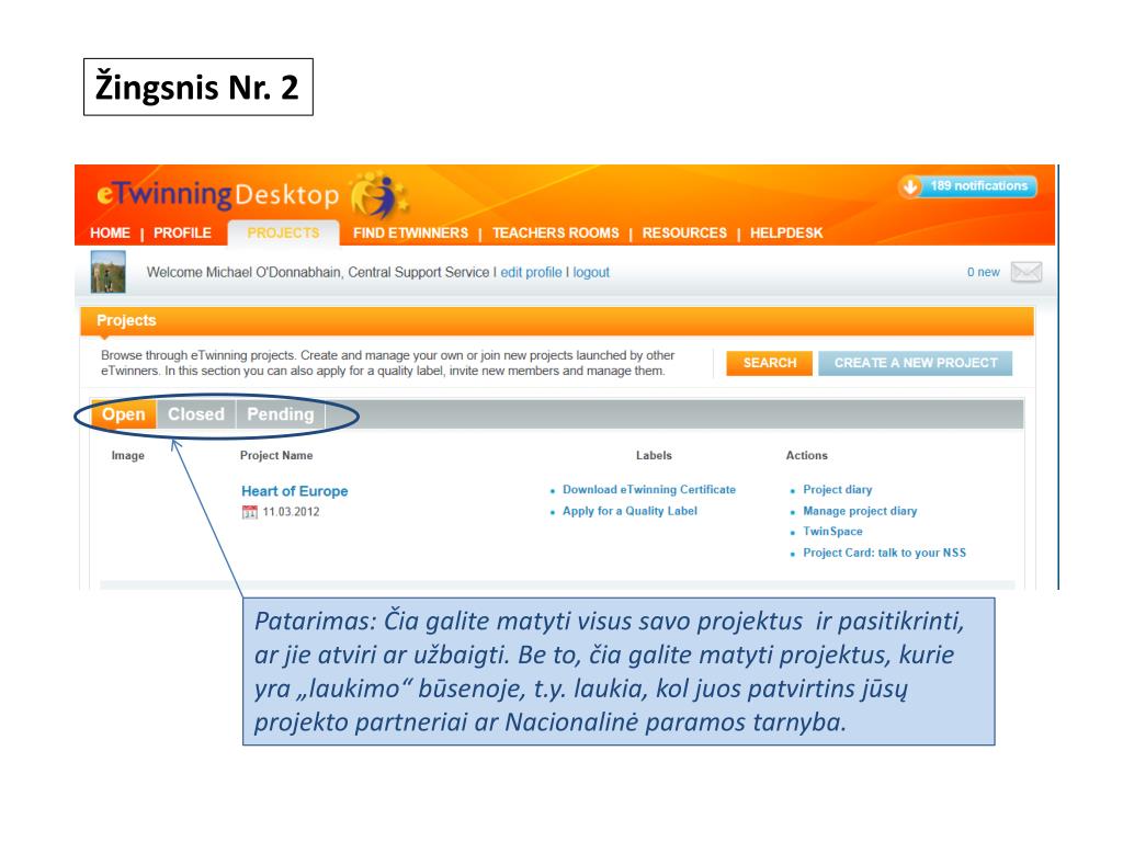 Žingsnis Nr. 2 Patarimas: Čia galite matyti visus savo projektus ir pasitikrinti, ar jie atviri ar užbaigti. Be to, čia galite matyti projektus, kurie yra „laukimo“ būsenoje, t.y. laukia, kol juos patvirtins jūsų projekto partneriai ar Nacionalinė paramos tarnyba.