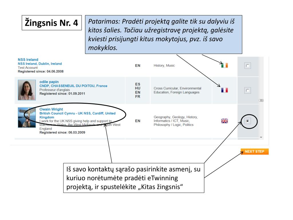 Žingsnis Nr. 4 Patarimas: Pradėti projektą galite tik su dalyviu iš kitos šalies. Tačiauužregistravę projektą, galėsite kviesti prisijungti kitus mokytojus, pvz. iš savo mokyklos. Iš savo kontaktų sąrašo pasirinkite asmenį, sukuriuo norėtumėtepradėti eTwinningprojektą, ir spustelėkite „Kitas žingsnis“
