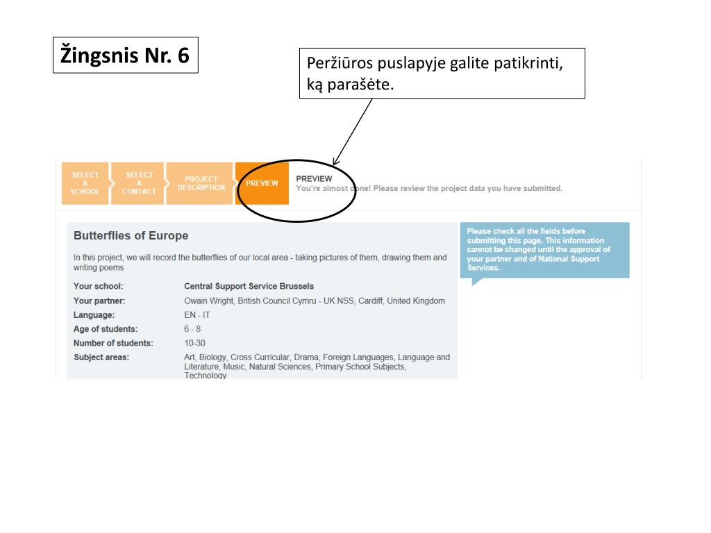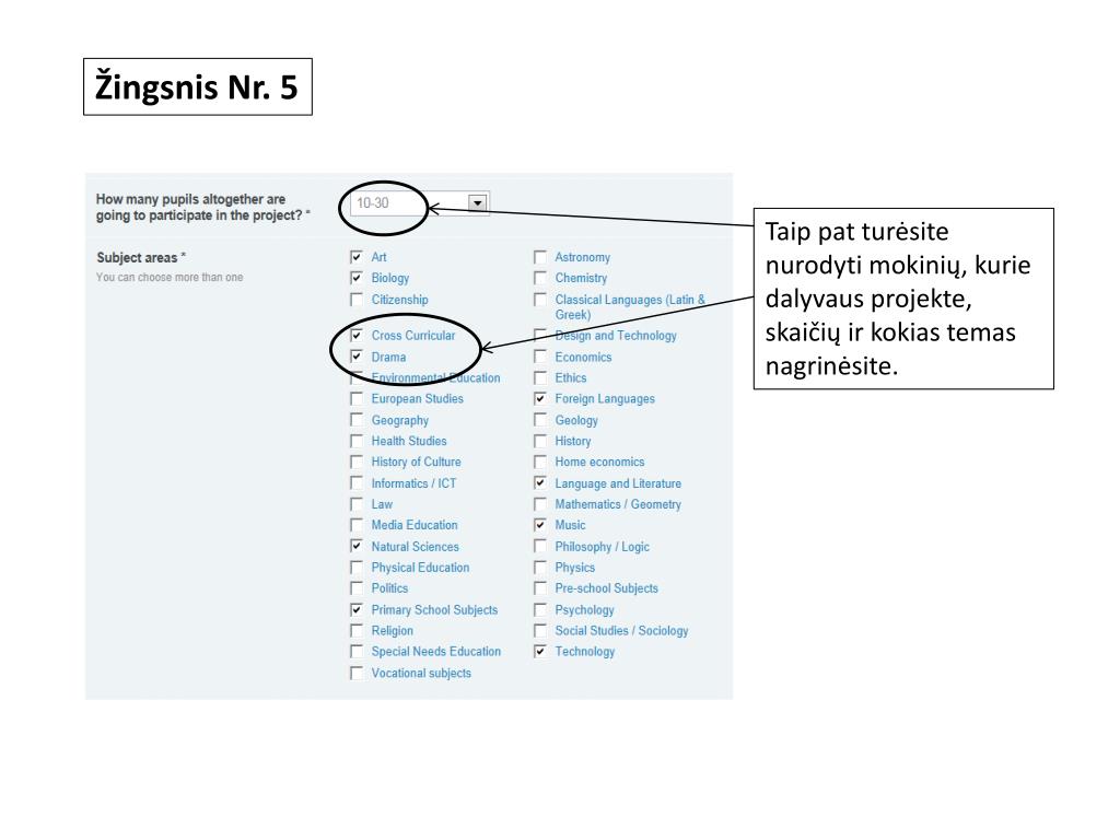 Žingsnis Nr. 5 Taip pat turėsite nurodyti mokinių, kurie dalyvaus projekte, skaičių ir kokias temas nagrinėsite.