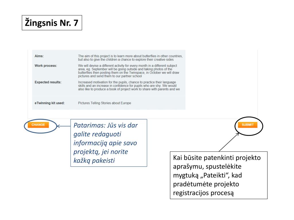 Žingsnis Nr. 7 Patarimas: Jūs vis dar galite redaguoti informaciją apie savo projektą, jei norite kažką pakeisti Kai būsite patenkinti projekto aprašymu, spustelėkite mygtuką „Pateikti“, kad pradėtumėte projektoregistracijosprocesą