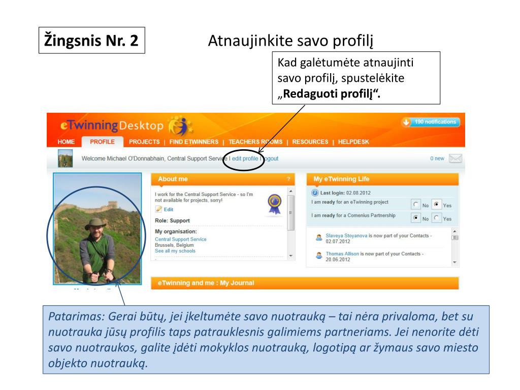 Atnaujinkite savo profilį Žingsnis Nr. 2 Galite redaguoti beveik visą informaciją savo profilyje:vardą, el. pašto adresą ir kt. Patarimas: Galitepasikeistiirslaptažodį Patarimas: Pasistenkite trumpai ir įdomiai aprašyti save, savo profesinius pomėgius, mokyklą, patirtį ir projekto idėjas. Labai svarbu rašant vartoti kalbą, kurią suprastų jūsų galimi partneriai, būtent todėl daug mokytojų turi profilius dviejomis kalbomis: savo gimtąja ir užsienio, plačiau suprantama kalba(anglų, prancūzų, ispanų ar vokiečių).