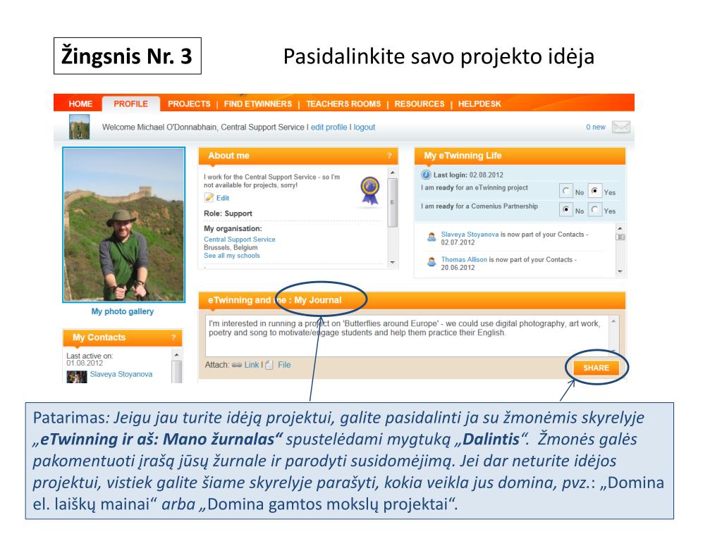 Žingsnis Nr. 3 Pasidalinkite savo projekto idėja Patarimas: Jeigu jau turite idėją projektui, galite pasidalinti ja su žmonėmis skyrelyje„eTwinningir aš: Mano žurnalas“ spustelėdami mygtuką „Dalintis“. Žmonės galės pakomentuoti įrašą jūsų žurnale ir parodyti susidomėjimą. Jei dar neturite idėjos projektui,vistiek galite šiame skyrelyje parašyti, kokia veikla jus domina, pvz.:„Domina el. laiškų mainai“arba „Domina gamtos mokslų projektai“.