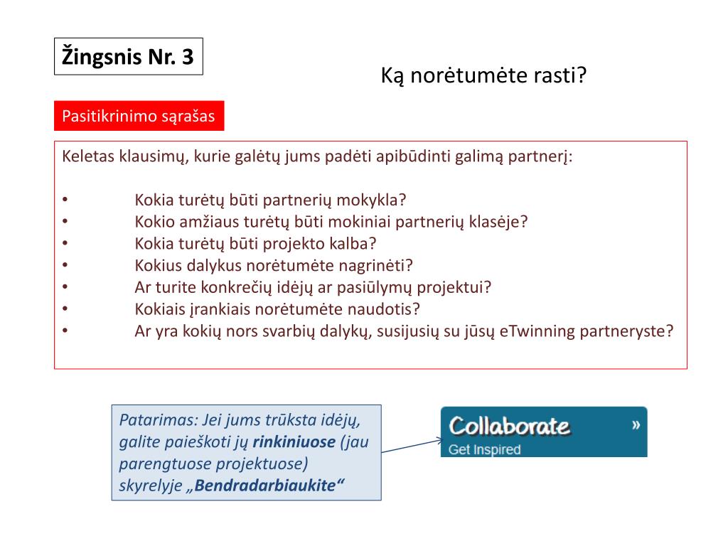 Žingsnis Nr. 3 Ką norėtumėte rasti? Pasitikrinimo sąrašas • Keletas klausimų, kurie galėtų jums padėti apibūdinti galimą partnerį: • Kokia turėtų būti partnerių mokykla? • Kokio amžiaus turėtų būti mokiniai partnerių klasėje? • Kokia turėtų būti projekto kalba? • Kokius dalykus norėtumėte nagrinėti? • Ar turite konkrečių idėjų ar pasiūlymų projektui? • Kokiais įrankiais norėtumėte naudotis? • Ar yra kokių nors svarbių dalykų, susijusių su jūsų eTwinningpartneryste? Patarimas: Jei jums trūksta idėjų, galite paieškoti jų rinkiniuose (jau parengtuose projektuose) skyrelyje „Bendradarbiaukite“