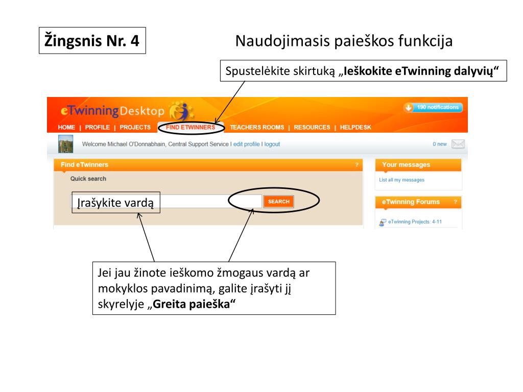 Naudojimasis paieškos funkcija Žingsnis Nr. 4 Spustelėkite skirtuką „Ieškokite eTwinning dalyvių“ Įrašykite vardą Jei jau žinote ieškomo žmogaus vardą ar mokyklos pavadinimą, galite įrašyti jį skyrelyje „Greita paieška“