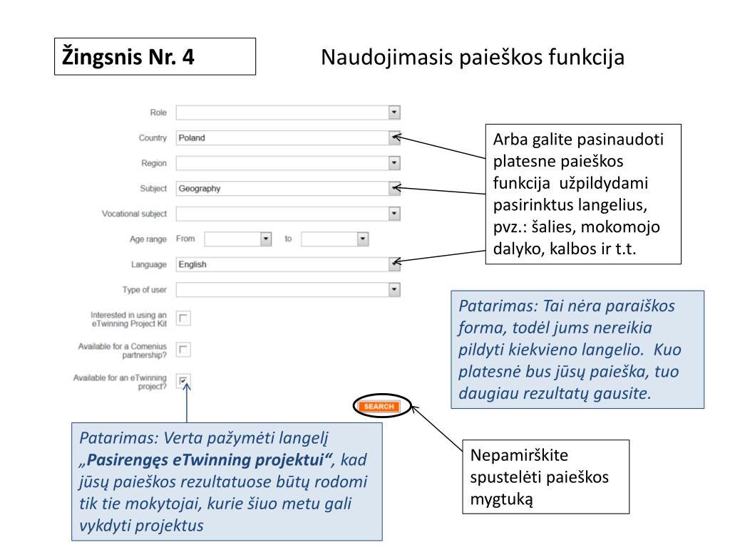 Žingsnis Nr. 4 • Naudojimasis paieškos funkcija Arba galite pasinaudoti platesne paieškos funkcija užpildydami pasirinktus langelius, pvz.:šalies, mokomojo dalyko, kalbos ir t.t. Patarimas: Tai nėra paraiškos forma, todėl jums nereikia pildyti kiekvieno langelio. Kuo platesnė bus jūsų paieška, tuo daugiau rezultatų gausite. Patarimas: Verta pažymėti langelį „PasirengęseTwinningprojektui“, kad jūsų paieškos rezultatuose būtų rodomi tik tie mokytojai, kurie šiuo metu gali vykdyti projektus Nepamirškite spustelėti paieškos mygtuką
