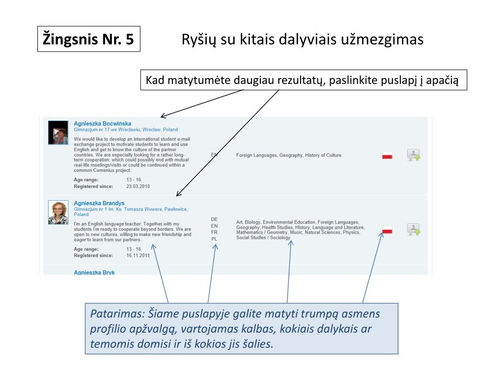 Žingsnis Nr. 5 Ryšių su kitais dalyviais užmezgimas Kad matytumėte daugiau rezultatų, paslinkite puslapį į apačią Patarimas: Šiame puslapyje galite matyti trumpą asmens profilio apžvalgą, vartojamas kalbas, kokiais dalykais ar temomis domisi ir iš kokios jis šalies.
