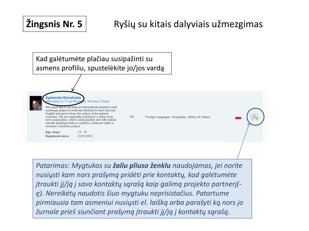 Žingsnis Nr. 5 • Ryšių su kitais dalyviais užmezgimas Kad galėtumėte plačiau susipažinti su asmens profiliu, spustelėkite jo/jos vardą Patarimas: Mygtukas su žaliu pliusoženklu naudojamas, jei norite nusiųsti kam nors prašymą pridėti prie kontaktų, kad galėtumėte įtraukti jį/ją į savo kontaktų sąrašą kaip galimą projekto partnerį(-ę). Nereikėtų naudotis šiuo mygtuku neprisistačius. Patartume pirmiausia tam asmeniui nusiųsti el.laiškąarba parašyti ką nors jo žurnale prieš siunčiant prašymą įtraukti jį/ją į kontaktų sąrašą.