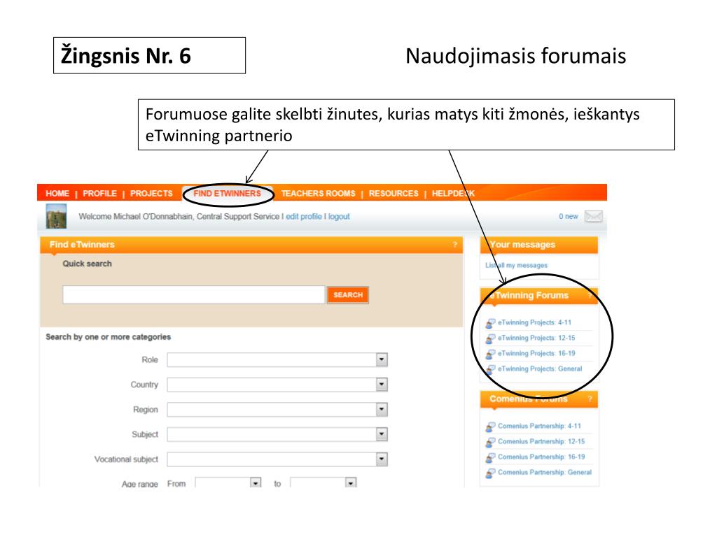 Žingsnis Nr. 6 Naudojimasis forumais Forumuose galite skelbti žinutes, kurias matys kiti žmonės, ieškantys eTwinning partnerio