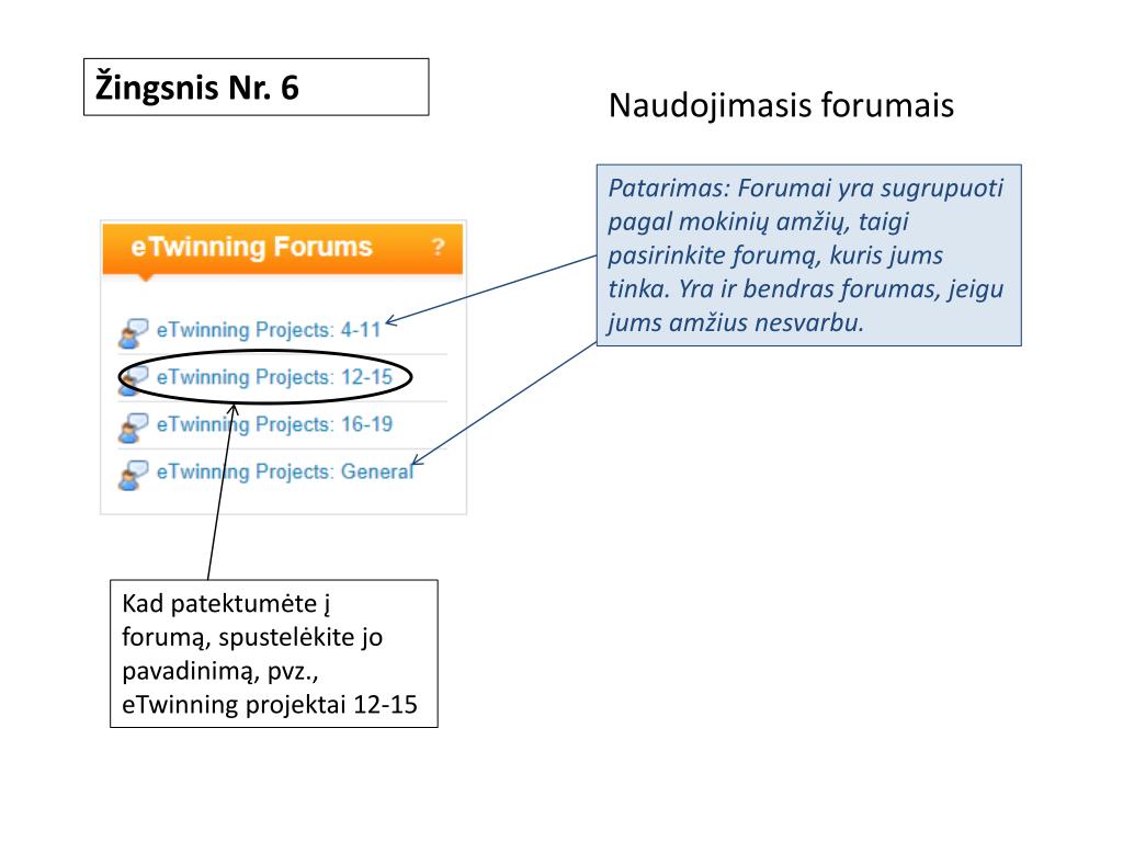 Žingsnis Nr. 6 • Naudojimasis forumais Patarimas: Forumai yra sugrupuoti pagal mokinių amžių, taigi pasirinkite forumą, kuris jums tinka. Yra ir bendras forumas, jeigu jums amžius nesvarbu. Kad patektumėte į forumą, spustelėkite jo pavadinimą, pvz.,eTwinningprojektai 12-15