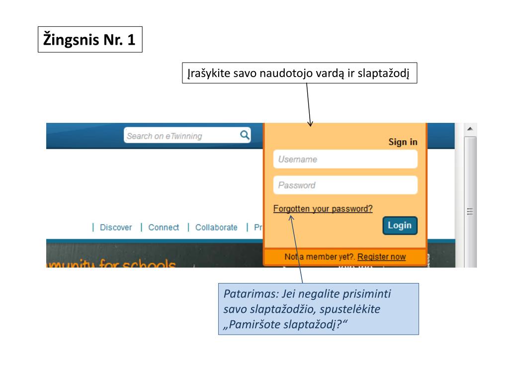 Žingsnis Nr. 1 Įrašykite savo naudotojo vardą ir slaptažodį Patarimas: Jei negalite prisiminti savo slaptažodžio, spustelėkite nuorodą „Pamiršote slaptažodį“