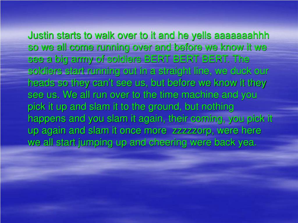 Justin starts to walk over to it and he yells aaaaaaahhh so we all come running over and before we know it we see a big army of soldiers BERT BERT BERT. The soldiers start running out in a straight line, we duck our heads so they can’t see us, but before we know it they see us. We all run over to the time machine and you pick it up and slam it to the ground, but nothing happens and you slam it again, their coming, you pick it up again and slam it once more zzzzzorp, were here we all start jumping up and cheering were back yea.