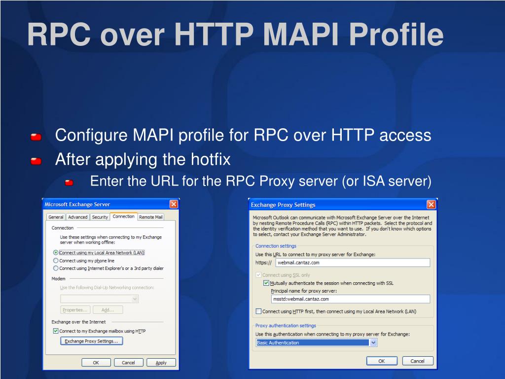 RPC over HTTP MAPI Profile • Configure MAPI profile for RPC over HTTP access • After applying the hotfix • Enter the URL for the RPC Proxy server (or ISA server)