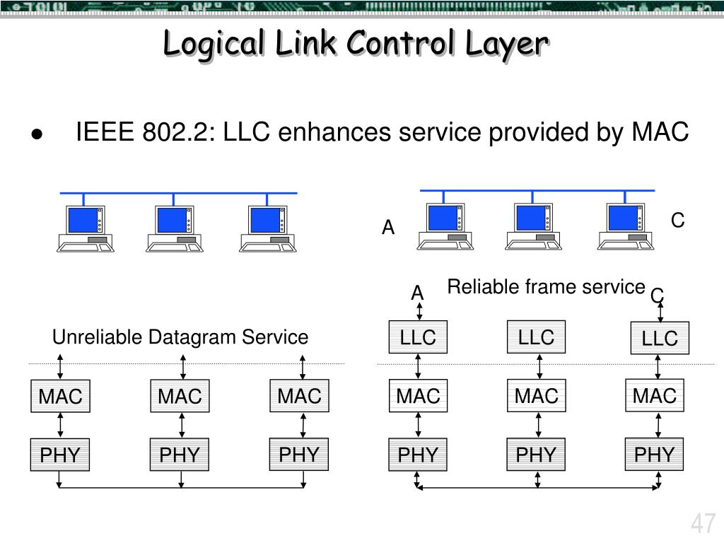 C A Reliable frame service A Unreliable Datagram Service C LLC LLC LLC MAC MAC MAC MAC MAC MAC PHY PHY PHY PHY PHY PHY Logical Link Control Layer • IEEE 802.2: LLC enhances service provided by MAC