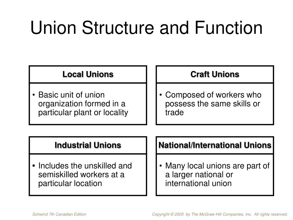 Craft Unions National/International Unions • Composed of workers who possess the same skills or trade • Many local unions are part of a larger national or international union Local Unions Industrial Unions • Basic unit of union organization formed in a particular plant or locality • Includes the unskilled and semiskilled workers at a particular location Union Structure and Function