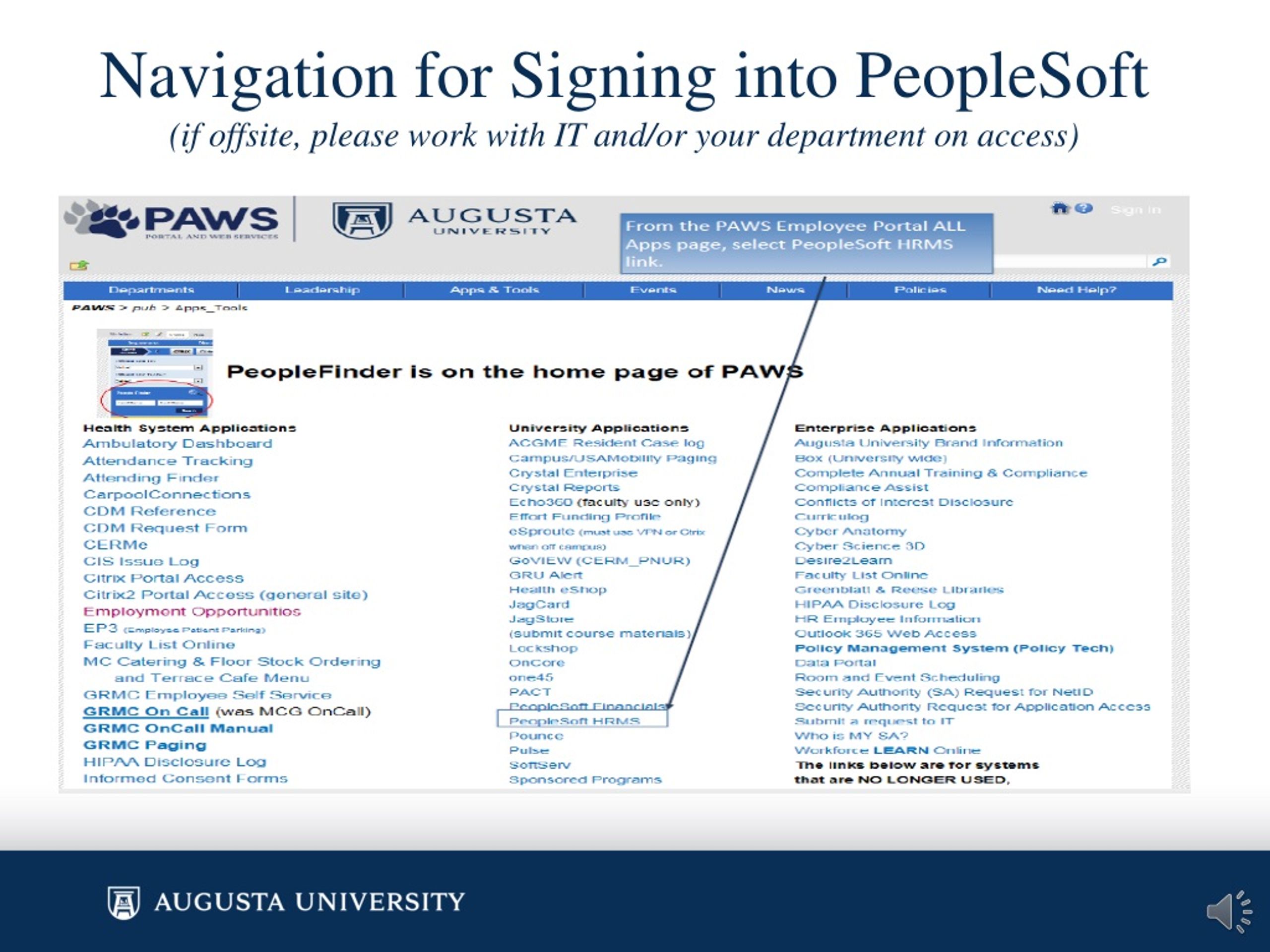 Navigation for Signing into PeopleSoft (if offsite, please work with IT and/or your department on access)