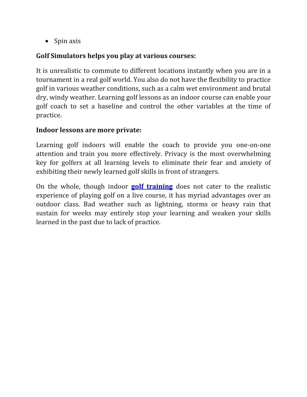 •Spin axis Golf Simulators helps you play at various courses: It is unrealistic to commute to different locations instantly when you are in a tournament in a real golf world. You also do not have the flexibility to practice golf in various weather conditions, such as a calm wet environment and brutal dry, windy weather. Learning golf lessons as an indoor course can enable your golf coach to set a baseline and control the other variables at the time of practice. Indoor lessons are more private: Learning golf indoors will enable the coach to provide you one-on-one attention and train you more effectively. Privacy is the most overwhelming key for golfers at all learning levels to eliminate their fear and anxiety of exhibiting their newly learned golf skills in front of strangers. On the whole, though indoor golf training does not cater to the realistic experience of playing golf on a live course, it has myriad advantages over an outdoor class. Bad weather such as lightning, storms or heavy rain that sustain for weeks may entirely stop your learning and weaken your skills learned in the past due to lack of practice.