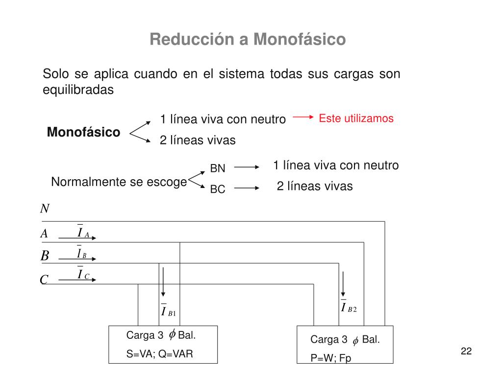 Reducción a Monofásico Solo se aplica cuando en el sistema todas sus cargas son equilibradas 1 línea viva con neutro Este utilizamos Monofásico 2 líneas vivas 1 línea viva con neutro BN Normalmente se escoge 2 líneas vivas BC Carga 3 Bal. S=VA; Q=VAR Carga 3 Bal. P=W; Fp