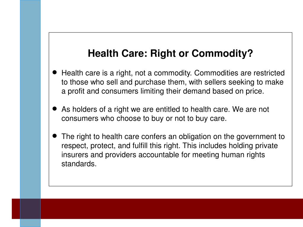 Health Care: Right or Commodity? • Health care is a right, not a commodity. Commodities are restricted to those who sell and purchase them, with sellers seeking to make a profit and consumers limiting their demand based on price. • As holders of a right we are entitled to health care. We are not consumers who choose to buy or not to buy care. • The right to health care confers an obligation on the government to respect, protect, and fulfill this right. This includes holding private insurers and providers accountable for meeting human rights standards.