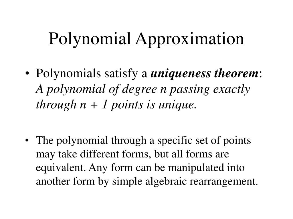 Polynomial Approximation • Polynomials satisfy a uniqueness theorem: A polynomial of degree n passing exactly through n + 1 points is unique. • The polynomial through a specific set of points may take different forms, but all forms are equivalent. Any form can be manipulated into another form by simple algebraic rearrangement.