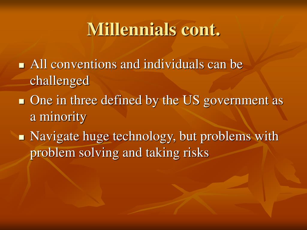 Millennials cont. • All conventions and individuals can be challenged • One in three defined by the US government as a minority • Navigate huge technology, but problems with problem solving and taking risks