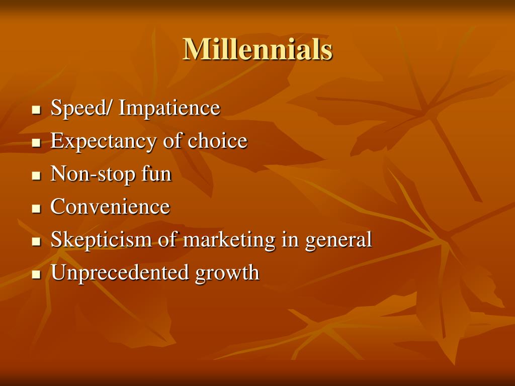 Millennials • Speed/ Impatience • Expectancy of choice • Non-stop fun • Convenience • Skepticism of marketing in general • Unprecedented growth
