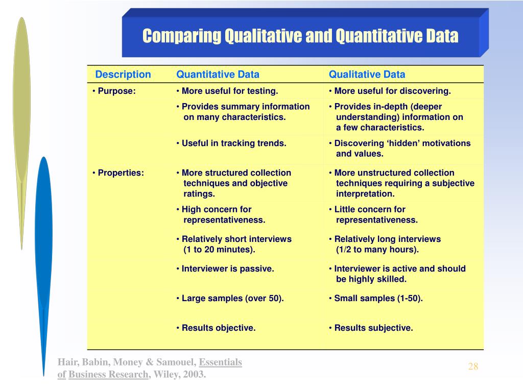 Qualitative Research • Searches academic & trade/professional literature. • Discovers and identifies ideas, thoughts, feelings, etc. • Exploratory research design. • Uses open-ended, unstructured, probing questions in interviews and focus groups and generates qualitative data. • Provides preliminary insights and understanding. • Limited ability to generalize findings, typically because samples are small and non-random. • Improves conceptualization. • Facilitates drafting questionnaires.